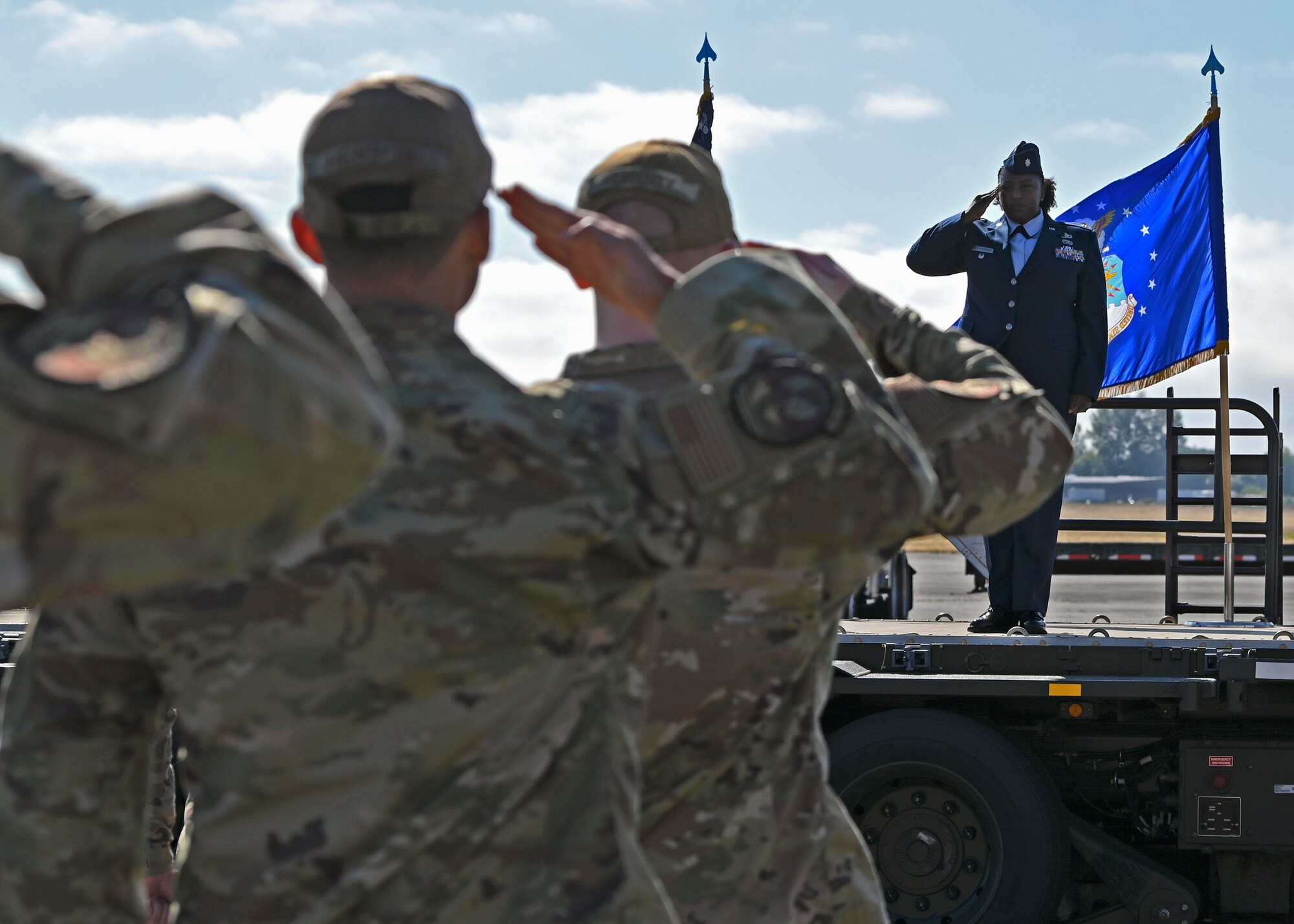 JOINT BASE LEWIS-MCCHORD, Wash. -- U.S. Air Force Lt. Col. Ayana Tuchscherer, right, commander of the 62nd Aerial Port Squadron, assumes command from Lt. Col. Mike Perez, commander of the 62nd Maintenance Group, during a change of command ceremony at Joint Base Lewis-McChord, Washington, July 21, 2022. The 62nd APS serves as the primary port for passenger and cargo shipments in the Pacific Northwest region and supports U.S. Transportation Command/Air Mobility Command missions for major exercises and deployments spanning the globe.