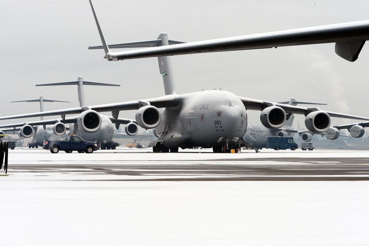 A C-17 Globemaster III aircraft is parked on the McChord Field ramp, Dec. 10, 2013 at Joint Base Lewis-McChord, Wash. Earlier in the morning, McChord Field experienced its first snow fall of the season. (U.S. Air Force photo/Airman 1st Class Jacob Jimenez)