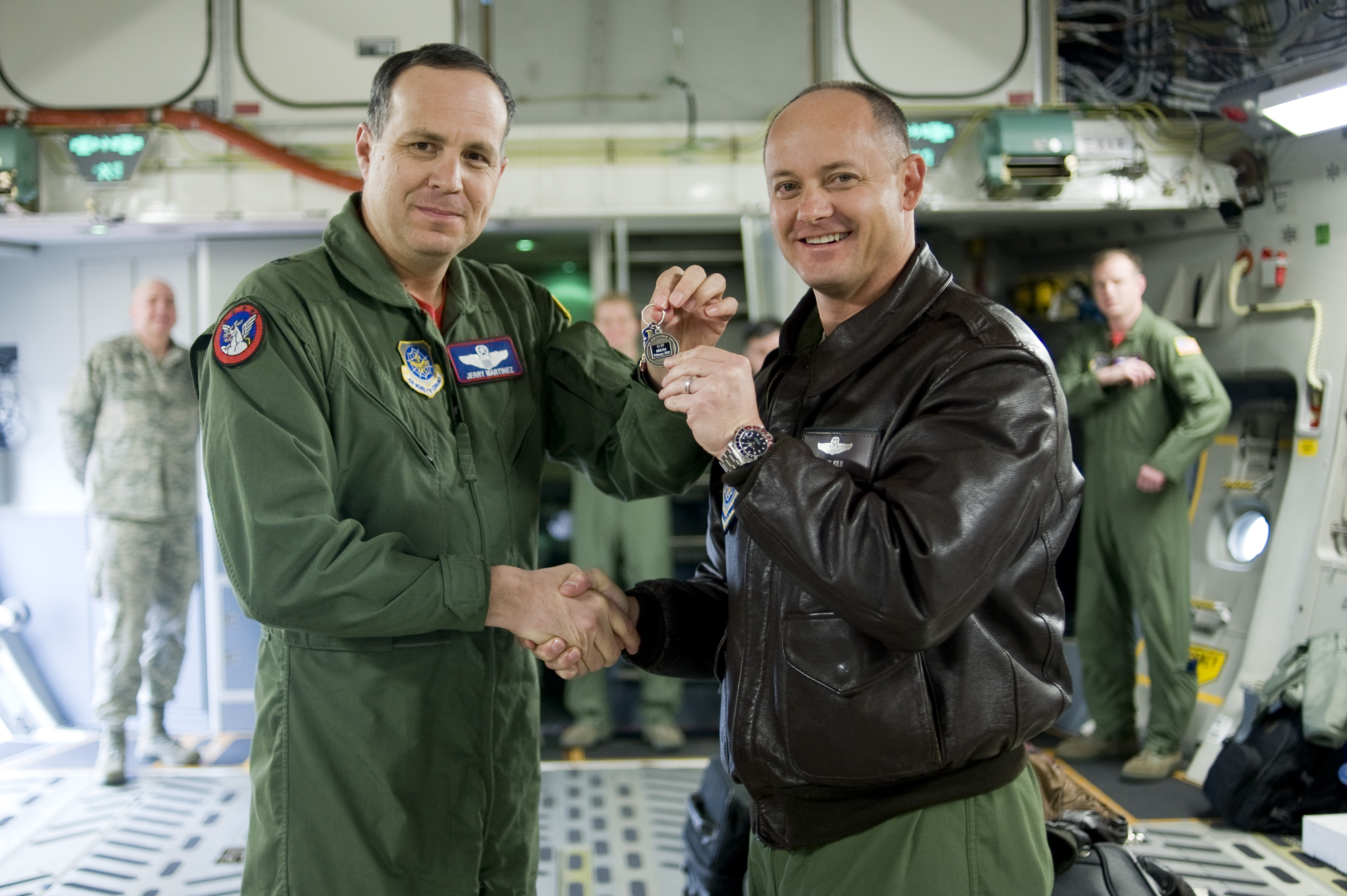 Brig. Gen. Jerry Martinez, Air Mobility Command, Inspector General, left, and Col. Kevin Kilb, 62nd Airlift Wing commander, pause for a photo-op onboard McChord's newest C-17 Globemaster III Thursday. Brig Gen. Martinez, piloted the aircraft from the Boeing factory in Long Beach, Calif. (U.S. Air Force Photo/Abner Guzman)