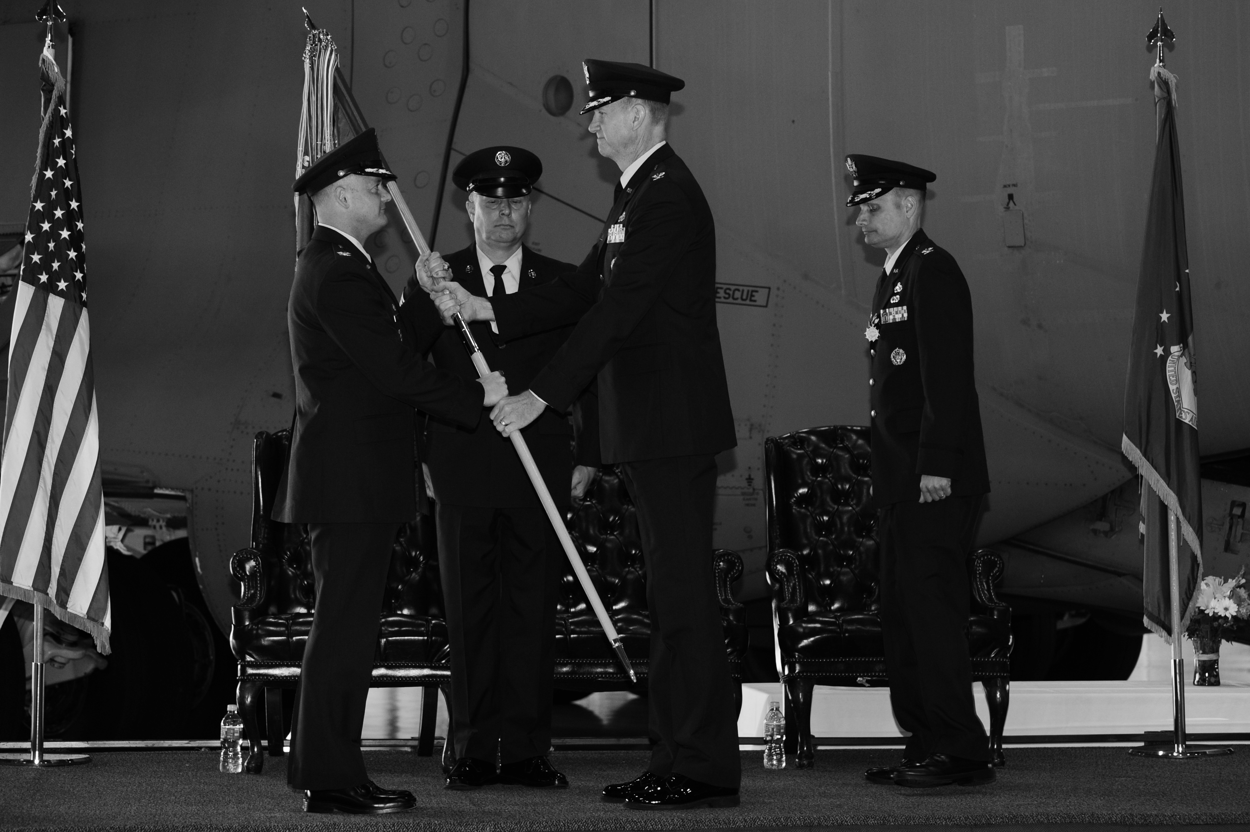 Col. Kevin Kilb, 62nd Airlift Wing commander, left, hands the 62nd Maintenance Group guidon to Col. Thomas Jackson during a Change of Command ceremony here June 14. (U.S. Air Force Photo/Staff Sgt. Frank D'Angelo)