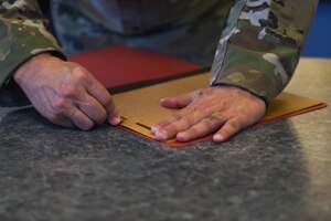 Senior Airman Irvin Matthews, left, Airman 1st Class Felipe Reyes-Cedeno, middle, and Staff Sgt. Adrian Carter, right, 627th Civil Engineer Squadron pavements and construction equipment technicians, secure a tar kettle and dispensing hose to drive back after finishing the resealing of several cracks