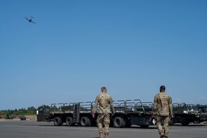 A C-17 Globemaster III from the 62d Airlift Wing, Joint Base Lewis-McChord, Washington, prepares for take off in the early morning hours during Rainier War 22B at Mountain Home Air Force Base, Idaho, Oct. 18, 2022. Exercise Rainier War is the 62d Airlift Wing’s most expansive exercise, where they